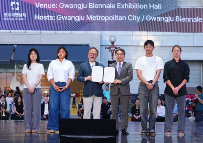 [코리아 이슈저널=김윤영 기자] 강기정 광주광역시장이 29일 오후 북구 광주비엔날레 광장 특설무대에서 열린 '2025 광주디자인비엔날레' 개막식에 참석해 국내·외 학생들로부터 광주포용디자인 매니페스토 선언서를 전달 받았다.