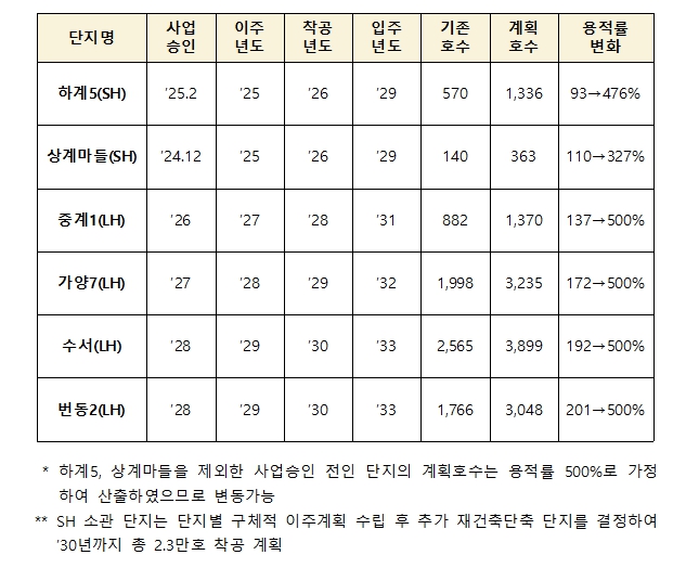 이어서 단지별 이주대책 마련 후, ’28년 중계1단지, ’29년 가양7, ’30년 수서·번동2 등 총 2.3만호 규모의 재건축을 순차적으로착공할 예정이다.