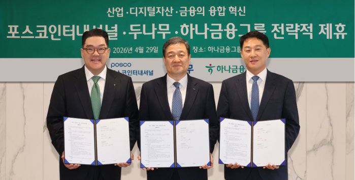 하나금융그룹은 29일 서울 명동 사옥에서 포스코인터내셔널, 두나무와 금융·산업·디지털자산 간의 융합 혁신으로 미래형 글로벌 금융 생태계 교두보 마련을 위한 3자 간 업무협약을 체결했다고 밝혔다.