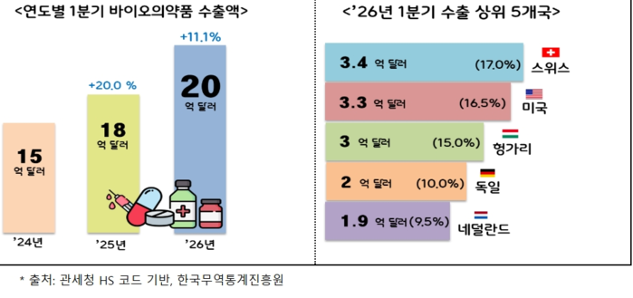 식품의약품안전처는 우리나라 바이오의약품 2026년 1분기 수출 규모가 지난해 1분기 수출액보다 11.1% 증가한 20억 달러(잠정)로 최대 기록을 달성했다고 10일 밝혔다.