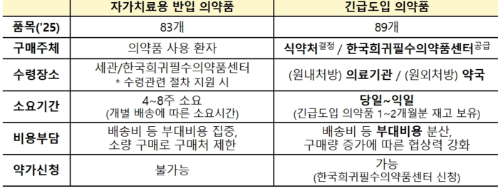 먼저 2026년부터 그간 환자가 해외에서 자가치료용으로 직접 구매한 희귀, 필수의약품을 정부가 직접 공급하는 긴급도입 품목으로 2030년까지 순차적으로 전환한다.