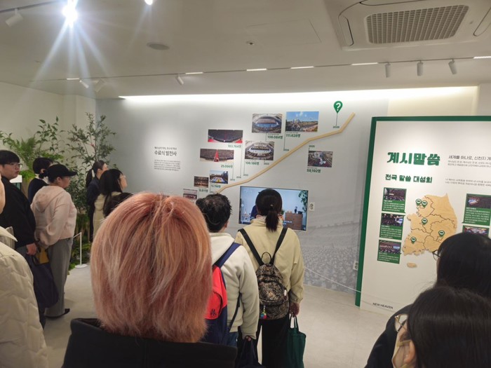 | ▲28일 신천지 강동교회에서 방문객들이 홍보관을 둘러보고 있다. |