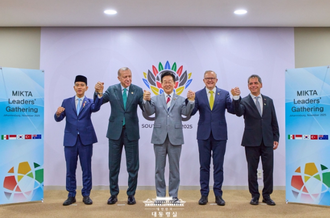 [코리아 이슈저널=최성일 기자] 주요 20개국(G20) 정상회의 참석을 위해 남아프리카공화국을 방문한 이재명 대통령은22일(현지시간) 오후 우리나라, 멕시코, 인도네시아, 튀르키예, 호주 5개국으로 구성된 믹타(MIKTA) 회원국 정상들과 회동했다.