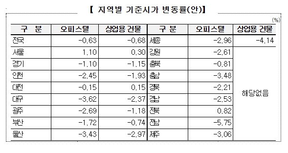 전년 대비 하락(오피스텔 0.6%↓, 상가 0.7%↓), 서울은 소폭 상승