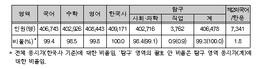 영어 영역의 경우, 사회탐구 영역 58.3%, 과학탐구 영역 22.4%이었으며, 사회탐구와 과학탐구 영역을 조합해 응시한 비율은 17.7%이었다.