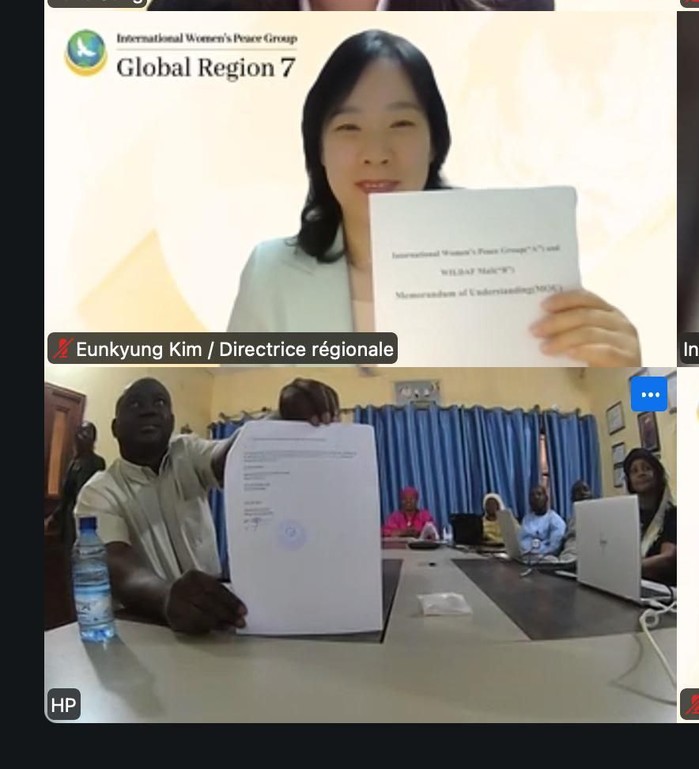 [코리아 이슈저널 = 최윤옥 기자] ㈔세계여성평화그룹(IWPG) 글로벌 7국(글로벌국장 김은경)이 지난 10일 말리의 여성·법·발전 분야 네트워크인 WiLDAF-AO(Women in Law and Development in Africa)와 업무협약(MOU) 체결식을 온라인으로 개최했다.